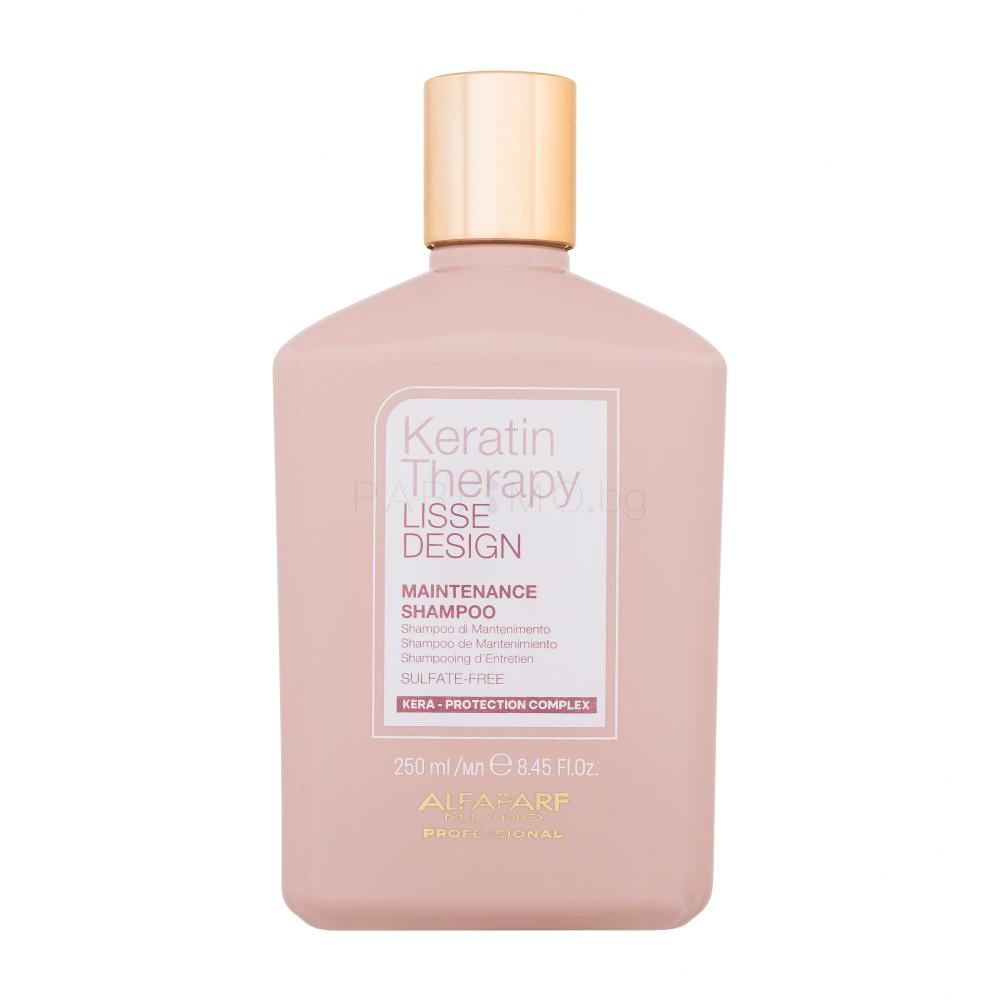 ALFAPARF MILANO Keratin Therapy Lisse Design Maintenance Shampoo е подхранващ изглаждащ шампоан за коса от професионалната линия Lisse Design Keratin Therapy, създаден да поддържа ефекта от кератиновото изправяне до 3 месеца. Формулата нежно почиства, без да нарушава резултатите от салонната процедура, като запазва косата гладка и мека. Шампоанът помага за намаляване на фриза, улеснява разресването и придава огледален блясък по дължините. Идеален е за тези, които искат косата им да остане права, лъскава и добре поддържана максимално дълго след професионално изправяне.