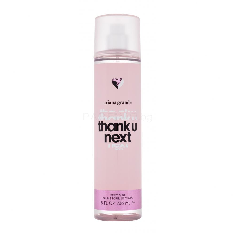 Увийте се в ароматен воал от кокос и макарони… Спрей за тяло Ariana Grande Thank U Next е толкова очарователен, че ще искате да го носите ден и нощ! Отваря се със сочни нотки на бяла круша и дива малина, омекотени от кремообразен кокос и деликатни листенца от роза в сърцето. В основата божественият кадифен мускус допълва стила на популярната певица Ариана Гранде, а сладостта на макарона флиртува с женствеността. Поглезете се със секси спрей за тяло Ariana Grande Thank U Next, пълен със сладост и младежко безгрижие.