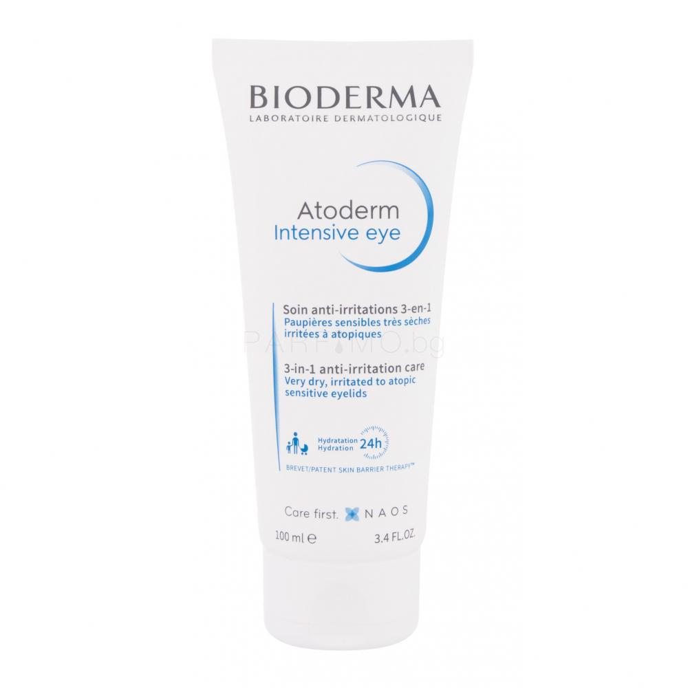 Околоочна грижа BIODERMA Atoderm Intensive Eye 3-In-1 Anti-Irritation Care глези раздразнените клепачи, като в същото време осигурява цялостна грижа: успокоява, възстановява и премахва грима. Благодарение на грижовния си състав, хидратира и подхранва кожата в зоната около очите, намалява сухотата и зачервяванията и осигурява дълготрайно облекчаване на сърбежа.