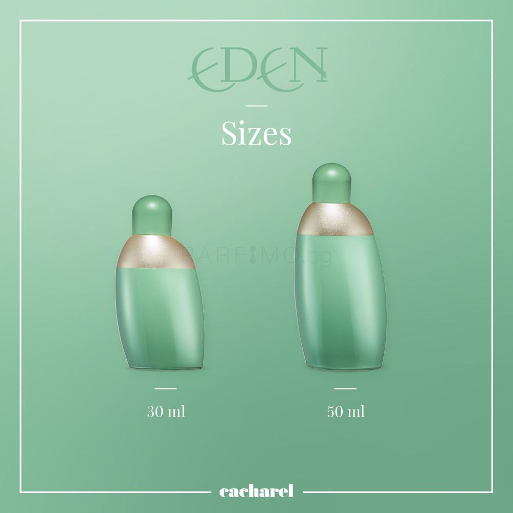 Отворете портите на Райската градина с дамски парфюм Cacharel Eden. Разходете се сред разцъфналите цветя, почувствайте топлината на слънчевите лъчи върху тялото си и се върнете назад във времето и си спомнете за забранения плод, на чието привличане е невъзможно да устоите. Ароматът, вдъхновен от градината, където Ева се разхожда с Адам, е един от бестселърите на марка Cacharel.