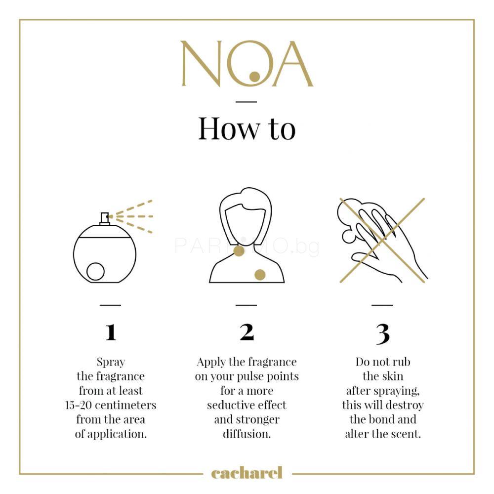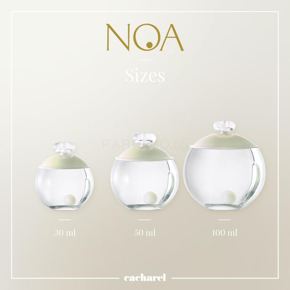 Освежаващи зелени нотки, нежно и женствено ухание на бял мускус, сочни акорди на праскова и нотки на божур и фрезия. Хармоничен концерт, който ви приветства още с първото вдишване. Сърцето обвива тялото ви във флорален воал с вплетени акорди на загадъчен жасмин, деликатна момина сълза, роза, лилия, иланг-иланг и трева. Финалните нотки откриват топлината на сандалово дърво, кедър, бобчета тонка и тамян. Ароматната симфония завършва с екзотични нотки на кафе и сладка ванилия. Изживейте мечтата си с парфюм Cacharel Noa EDT.