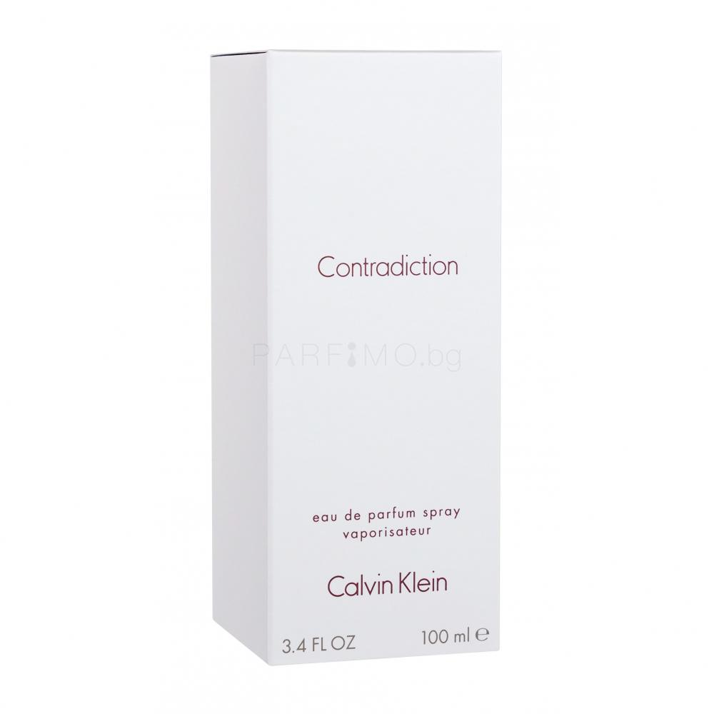 Парфюм Calvin Klein Contradiction е сапунено чист, отличителен, но ненатрапчив аромат за модерни жени. Той е проектиран от известната парфюмеристка Ann Gottlieb за марка Calvin Klein през 1998 г. След нанасяне, първите нотки, които се развиват, са деликатна момина сълза, жасмин, роза, божур, след това чувствена орхидея и опияняваща лилия. Нетрадиционното сърце предлага евкалипт, круша, жасмин, люляк и горски плодове. Сандалово дърво, бобчета тонка и мускус са смесени в основата. За най-добър ефект нанесете аромата върху пулсовите точки отново след около 6 часа.