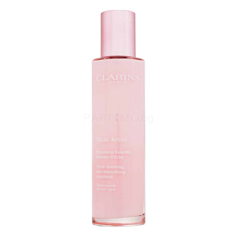 Clarins Multi-Active Glow Boosting Line-Smoothing Emulsion е озаряваща емулсия с ниацинамид, която съживява кожата, придава ѝ естествен блясък и помага да запази своята енергия и устойчивост.