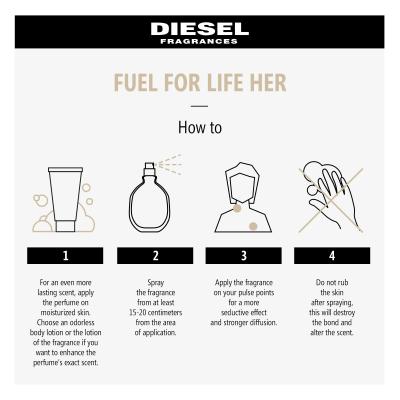 Портфолиото на Diesel включва дрехи, бижута, очила, часовници, аксесоари за дома и луксозна козметика за жени и мъже. Неговите продукти и иновативни рекламни кампании ще впечатлят всички любители на оригиналността и безкомпромисното качество. Парфюм Diesel Fuel For Life Femme също говори за тези вечни ценности. „Най-красивият аромат, който някога съм имал. Когато го имам, това съм аз," споделя наша клиентка в ревюто. Друг потребител добавя: "Ароматът, който беше възхваляван от повечето хора в моето най-близко обкръжение." Сега Fuel For Life Femme може също да стане вашият ТОП парфюм или да зарадвате партньора си с него.