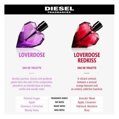Сърцето ви ще забие лудо с първия полъх на дамски парфюм Diesel Loverdose, специално създаден за романтична среща. Зад уникалния дизайн на флакона се крие ориенталско-ванилова композиция, която ще ви плени. Бъдете жената, на която мъжете не могат да устоят и се обвийте в опасно примамлив воал, изтъкан от плодови, флорални, дървесни и пикантни нотки.