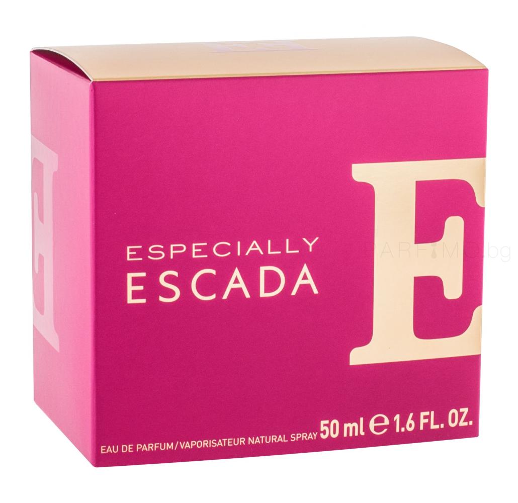Especially Escada е кадифена и деликатна комбинация от рози, покрити с капки сутрешна роса, придружени от чувствения иланг-иланг . Крушата в началото на аромата добавя сладкия акцент в цялата композиция. Парфюм Especially Escada е дело на великия парфюмерист Jean-Michel Duriez, лансиран през 2011 г.