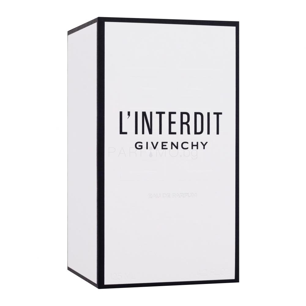 Парфюм Givenchy L'Interdit е изискан аромат за самоуверени жени, които не се страхуват да поемат рискове и са винаги мотивирани за нови предизвикателства. Те чертаят нови пътища и получават заслужено възхищение. L'Interdit е предимно есенно-зимен дневен и вечерен аромат, с който ще предизвикате възхищение. Подчертайте чара си със смелия и харизматичен аромат L'Interdit!