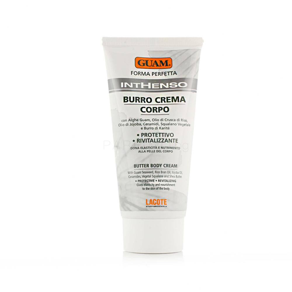 GUAM Inthenso Butter Body Cream 150 ml е масло за тяло с богат състав, което осигурява интензивна хидратация и подхранване на кожата благодарение на комбинацията от морски водорасли GUAM и високоефективни натурални масла. Специално разработената формула оставя кожата мека, еластична и защитена от изсушаване. Маслото е подходящо за ежедневна грижа, особено за суха и чувствителна кожа.