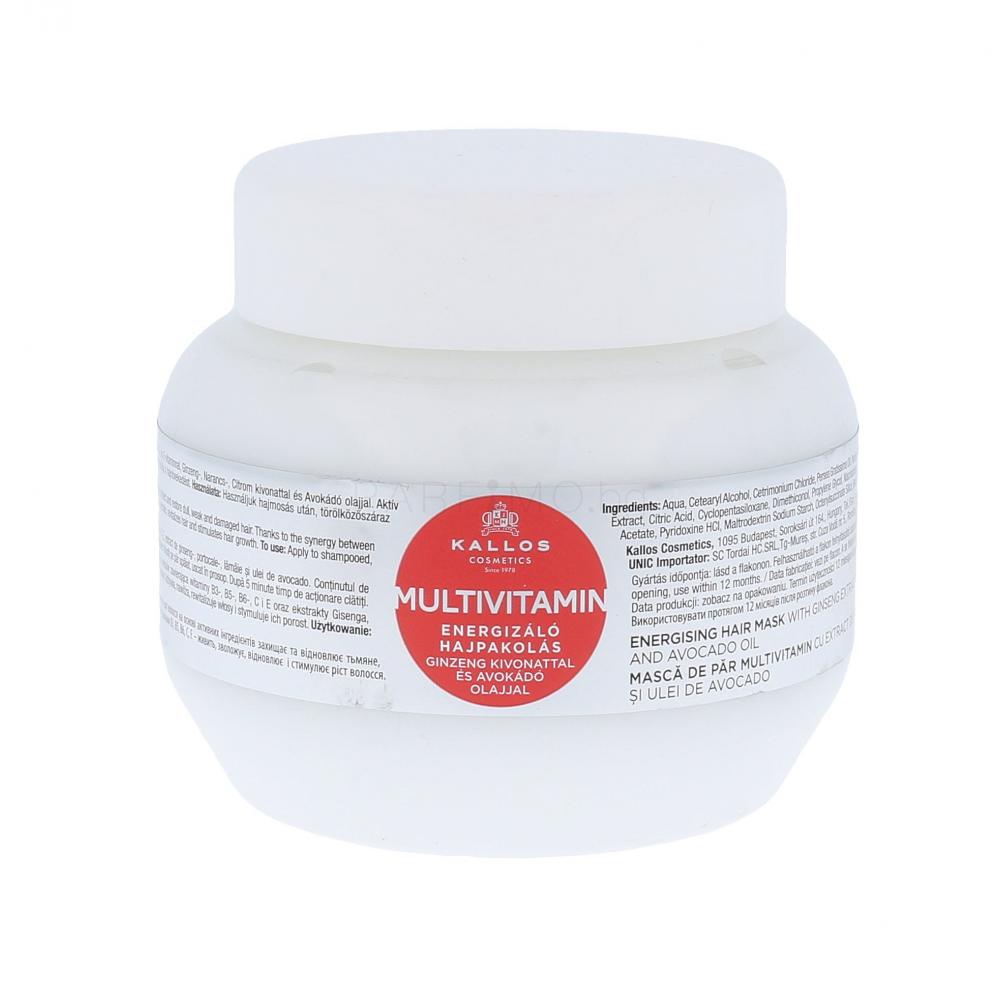 Маска за коса Kallos Multivitamin Hair Mask. Маската за коса Kallos Multivitamin Hair Mask хидратира в дълбочина сухата и увредена коса. Съставът е обогатен с масло от авокадо и екстракт от женшен, които придават на косата жизненост и енергичност. След употреба косата Ви ще бъде хидратирана, свежа и здрава.