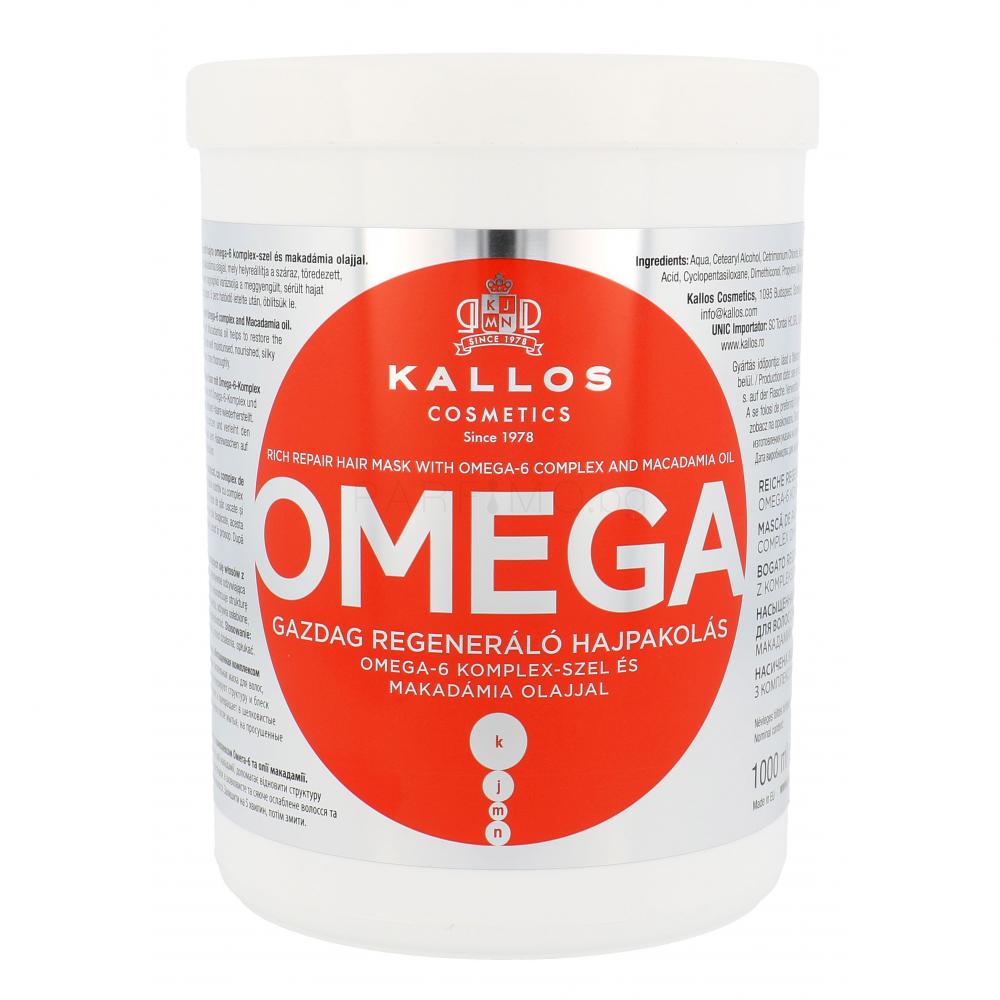 Възстановяваща маска за коса Kallos Omega Hair Mask. Маската за коса Kallos Omega Hair Mask интензивно се грижи за косата, придава ѝ сила и хидратация. Съставът е обогатен с масло от макадамия и Омега-6 комплекс. Тези компоненти перфектно възстановяват и регенерират структурата на косъма.