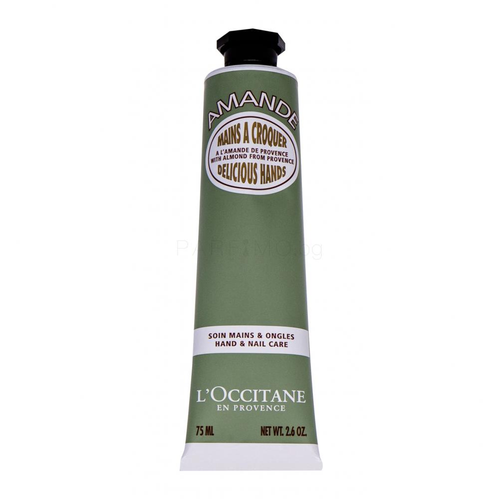 Подхранващ крем за ръце L'Occitane Almond (Amande) Delicious Hands с бадемово мляко и масло от сладък бадем омекотява кожата и я оставя защитена.