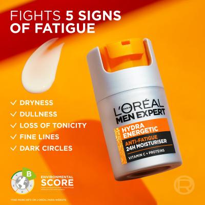Съживете кожата си с хидратиращ крем за мъже L'Oreal Paris Men Expert Hydra Energetic Anti-Fatigue Moisturiser. Намалява видимите признаци на умора и предпазва кожата от ефектите на стреса. Укрепва естествената защита на кожата, за да я поддържа спокойна, мека и еластична.