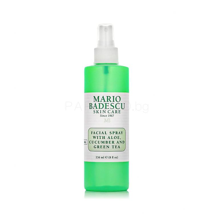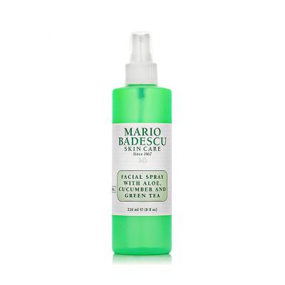 Многофункционалният лосион в спрей Mario Badescu Aloe, Cucumber and Green Tea е много популярен. Приятна текстура, обогатена с алое вера, краставица и зелен чай, която охлажда и освежава кожата на лицето, шията и деколтето. Тази веган козметика не съдържа глутен и алкохол, не е тествана върху животни и има екологична опаковка. Предпочитана е и хидратиращата мъгла на Mario Badescu, която съдържа алое вера, мащерка и розова вода или алое вера, лайка и лавандула. Можете да изберете продуктите и в подаръчен комплект.