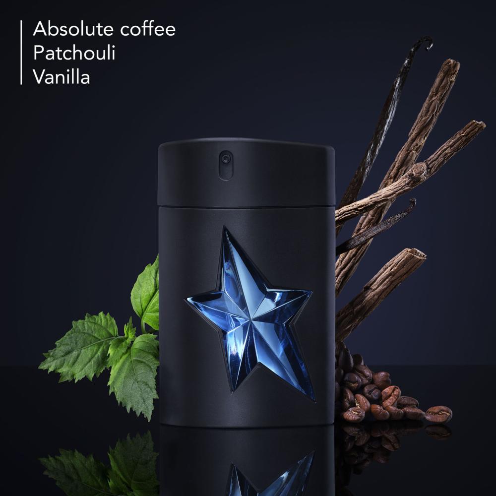 Симфонията започва със свежестта на мандарина и бергамот заедно със зелени нотки, сладки плодове и ментол. Сърцето на тоалетната вода бие в ритъма на топло кедрово дърво, загадъчен жасмин, екзотично пачули и вкусното трио от мляко, карамел и златист мед. Ако намирате тази комбинация за вълшебна, базата, изградена от сандалово дърво, пачули, бензоин, бобови зърна, слънчев кехлибар, неповторимия аромат на кафе и уханието на ванилия, няма да ви остави безразлични. Аромат или мечта? Линията е много тънка при тоалетната вода Mugler A-Men.
