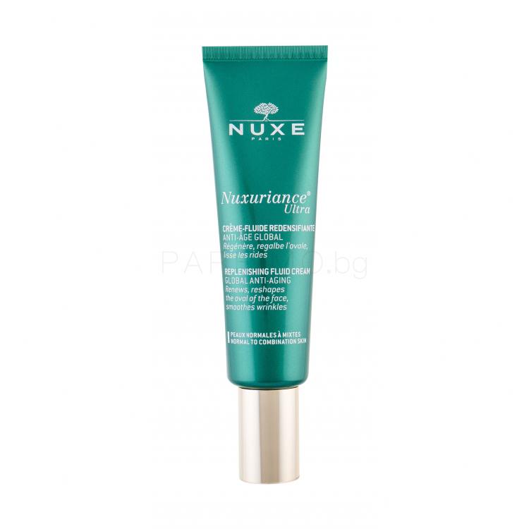 NUXE Nuxuriance Ultra Replenishing Fluid Cream е луксозен дневен крем, създаден да възстановява, стяга и озарява зрялата кожа с редуцирана плътност и еластичност. Леката му текстура се абсорбира бързо, оставя матов и кадифен завършек и подпомага контура на лицето, като придава усещане за „напълнена“ кожа с по-гладка повърхност.