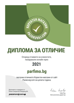 Пазарувайте без излишни притеснения! Поръчването на стоки в онлайн магазин Parfimo.bg е лесно, бързо и сигурно. Хиляди доволни клиенти както и независими асоциации за електронна търговия потвърдждават това. Разгледайте нашите сертификати, награди и отличия.