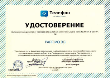 Parfimo.bg премина успешно проверката "Таен Клиент", като показа отлични положителни резултати. Удостоверението се присъжда на фирми, които се характеризират с най-високо качество на клиентско обслужване, както и професионални познания в областта на парфюмерията и козметиката. Сертификатът е потвърждение за компетентността и практическите познания на персонала в компанията.